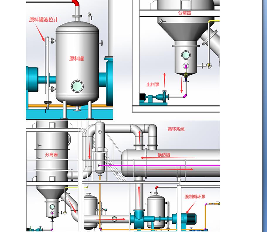 MVR蒸發(fā)系統(tǒng):MVR蒸發(fā)器不同于普通單效降膜或多效降膜蒸發(fā)器,MVR為單體蒸發(fā)器,集多效降膜蒸發(fā)器于一身,根據(jù)所需產(chǎn)品濃度不同采取分段式蒸發(fā),即產(chǎn)品在第一次經(jīng)過(guò)效體后不能達(dá)到所需濃度時(shí),產(chǎn)品在離開(kāi)效體后通過(guò)效體下部的真空泵將產(chǎn)品通過(guò)效體外部管路抽到效體上部再次通過(guò)效體,然后通過(guò)這種反復(fù)通過(guò)效體以達(dá)到所需濃度。
